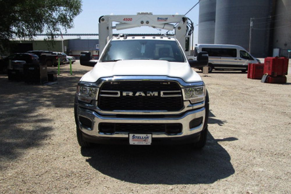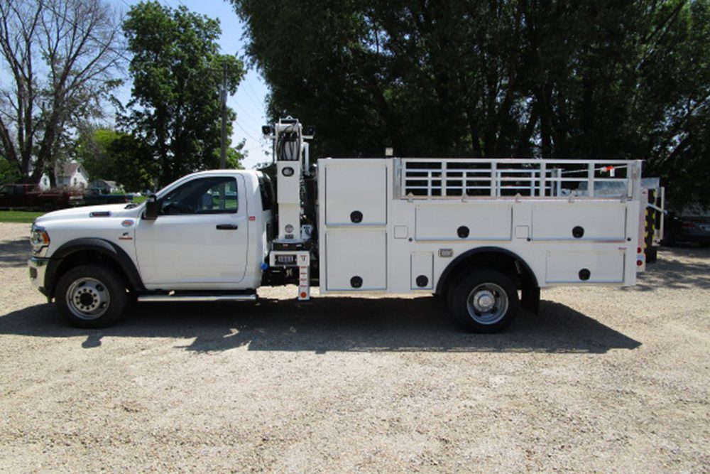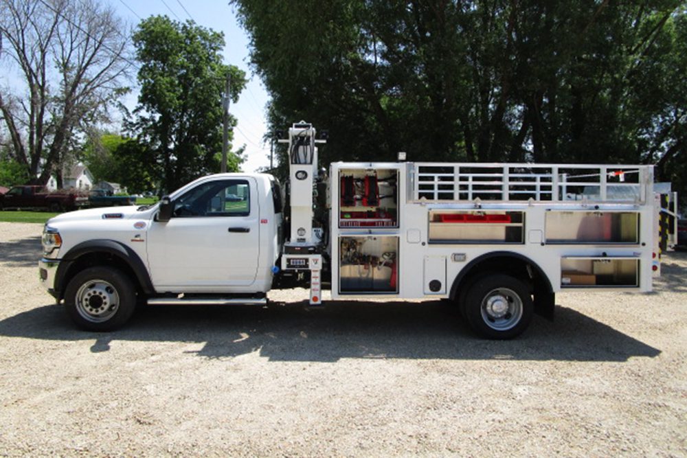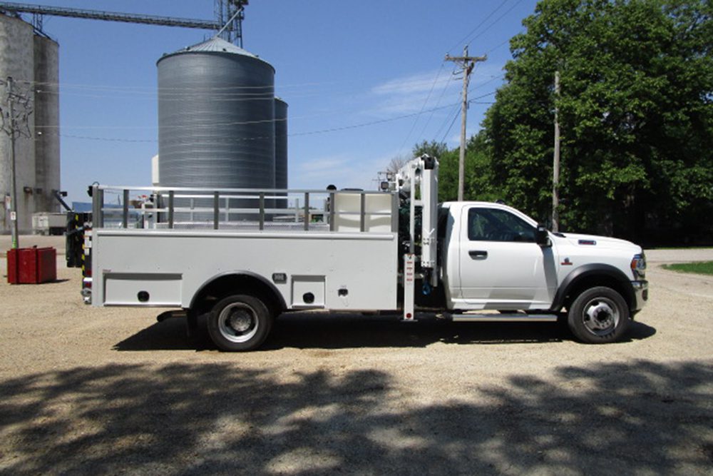 - Side-mount mast crane with 17′ of reach from center line of chassis