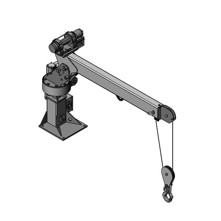 Stellar® Model EC2000-P (30″ stowed height), 6500 ft/lb., maximum 1-part line capacity 1000 lbs., maximum 2-part line capacity 2000 lbs., 12V electric winch with 12′ detachable remote pendant control, 12V power rotation, manual reach to 7′, painted white