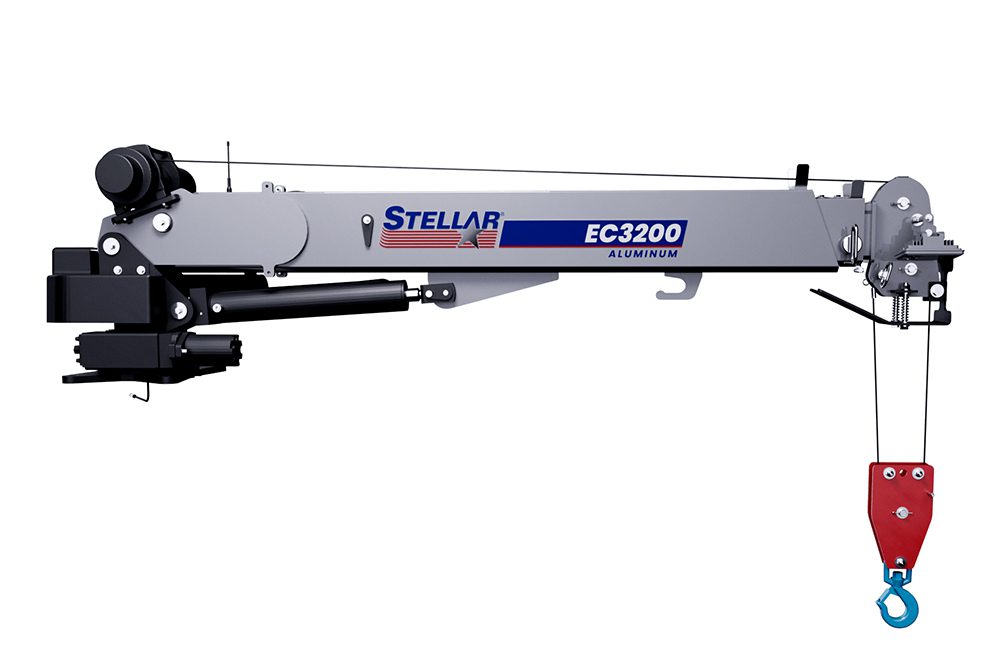 Stellar® Model EC3200 Telescopic crane – 11,500 ft/lb, 3200 lb. maximum capacity, 12V electric/hydraulic only, hydraulic/manual reach to 15′, four-function radio remote standard, 12V electric planetary winch with 17 ft./min. maximum single line speed, double acting cylinders with integral counterbalance valves, gear bearing rotation system, double boom design. Painted white. Narrow mount, mounts on 14″ side packs