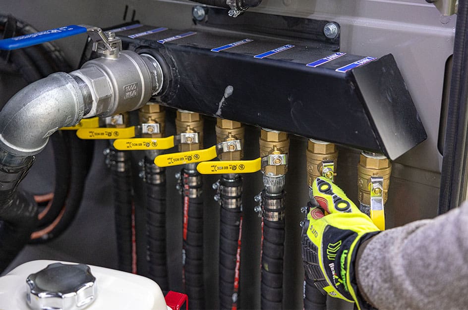 - Gas-powered 5.5 hp motor with 2″ pump. Capable of 40 gpm. Dual-filter system with high-flow auto nozzle.