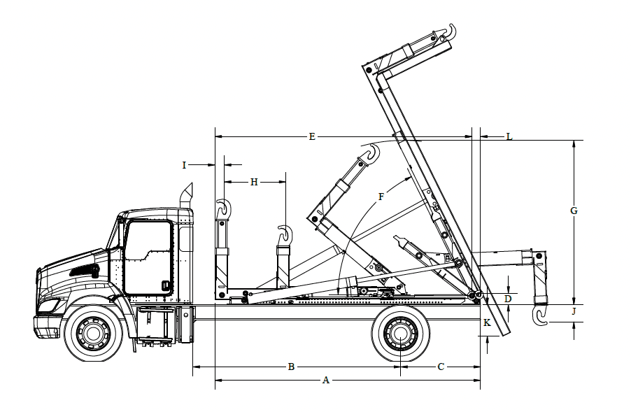 • Dump section: Integrated body lock mounting holes on the dump section eliminate the need to cut off and weld on locks. On the short and medium versions, the dump section articulates back for best-in-class below-chassis frame reach for 36″ containers.