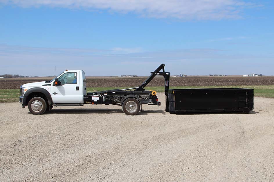 No other hooklift manufacturer currently offers the flexibility of the Stellar® Shuttle16. The Shuttle16 can handle dump containers ranging from 8′ to 15′ and flatbeds ranging from 10′ to 16′ and has a lifting capacity of up to 16,000 lbs. It has a maximum dump angle of 50˚ to 54˚, depending on the length of body.