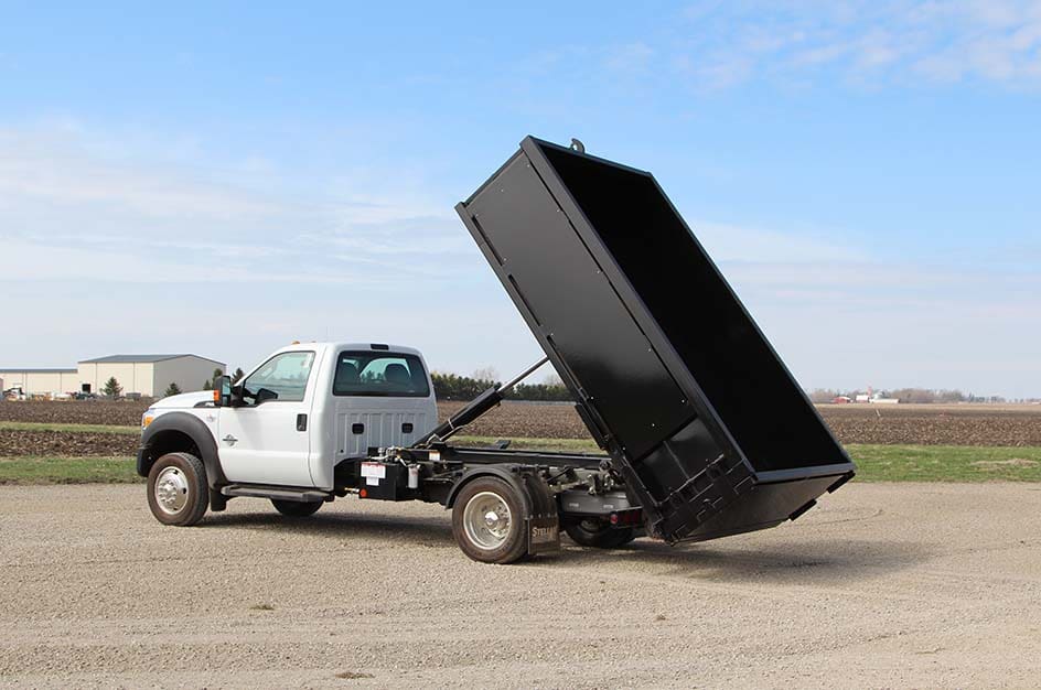 - Will accommodate bodies from 8′ up to 15′ long and still retain the maximum rated dump angle on a 41″-high frame truck. Longer bodies may be accommodated with reduced dumping capabilities.