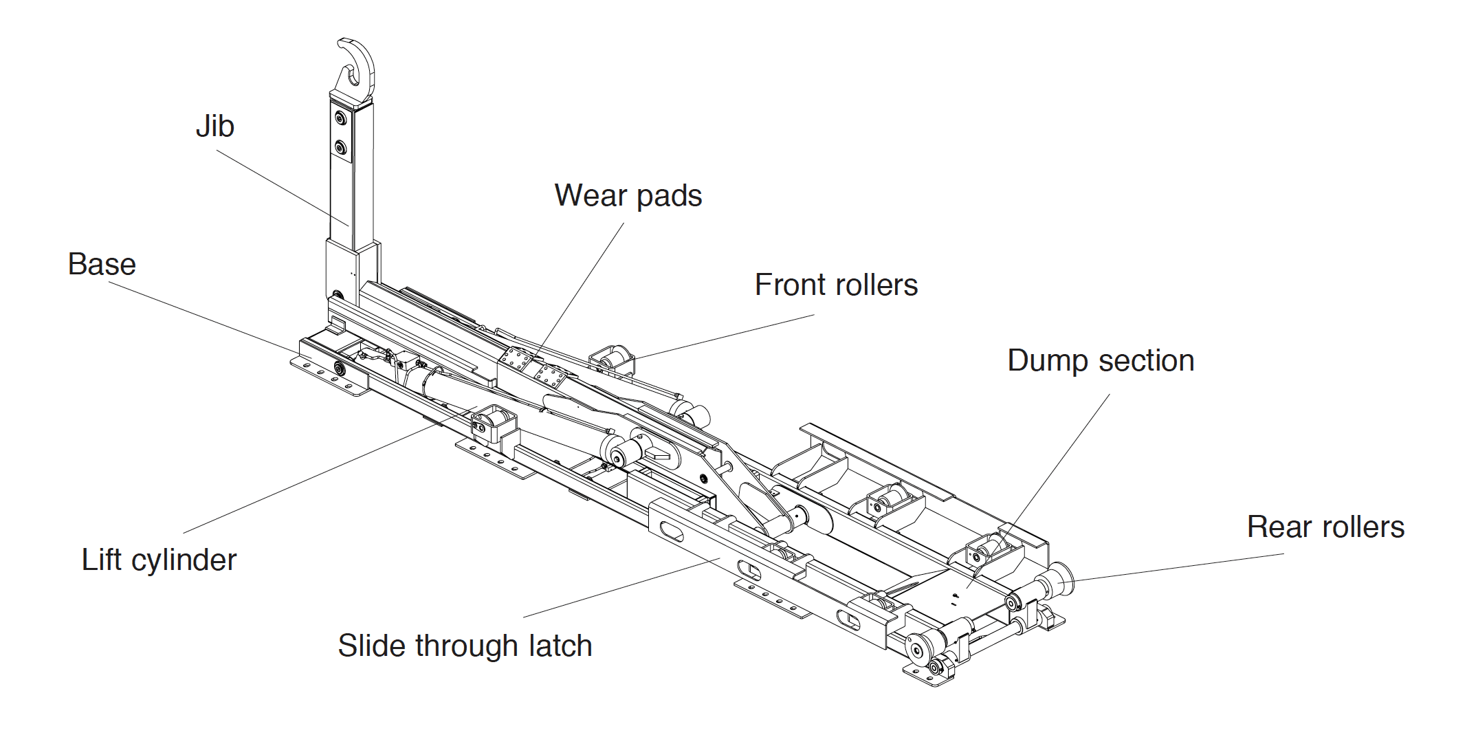 - Dump section: Dumping is accomplished through the rear pivot point. Jib and dump sections must lock together to support the full length of container/body when in the dump mode.